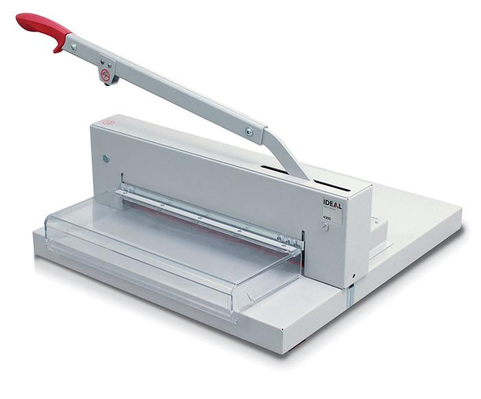 - гильотинные. Бывают напольные и настольные. Сверху расположен массивный нож с прямым лезвием, который опускается вертикально вниз по направляющим. Рабочая зона снабжена боковыми и задними упорами, а также прижимным механизмом, фиксирующим стопку, чтобы во время реза не было смещения. Такой принцип дает идеально ровный и перпендикулярный рез по всей ширине, без перекосов и шероховатых краев, что особенно важно при обработке большого количества страниц для книг, журналов и брошюр. Работа происходит так: оператор устанавливает стопку бумаги на платформу, выравнивает ее по заднему ограничителю, зажимает с помощью прижимного механизма и запускает нож. В зависимости от модели, нож может приводиться в движение вручную, рычагом, или автоматически — с помощью электропривода и гидравлики. При опускании лезвия усилие распределяется равномерно, и стопка разрезается сразу, одним четким движением. Базовые модели способны разрезать стопку толщиной до 5 см, что соответствует примерно 400–500 листам офисной бумаги. Профессиональные промышленные машины режут пачки толщиной 8–10 см, то есть более 1000 листов за один раз. Кроме бумаги, такие инструменты без проблем справляются с картоном, плотной обложкой и ламинированными материалами;