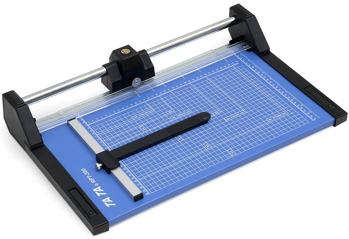 - роликовые. На направляющей закреплен роликовый нож — небольшой цилиндрический корпус с вмонтированным круглым лезвием. Нож закрыт пластиковой оболочкой, поэтому при работе не соприкасается напрямую с руками. На столике нанесена разметка в сантиметрах и дюймах, а также сетка для точного совмещения листов. Лезвие у роликового резака дисковое и заточенное по кругу, напоминает миниатюрное колесо. Чтобы провести рез, нужно прижать лист к рабочей поверхности с помощью прозрачной прижимной планки, а затем провести роликом по направляющей. Лезвие вращается при движении вперед или назад, прорезая бумагу в точке контакта. Поскольку диск острый по всей окружности, рез происходит плавно, без рывков, и обрабатываемый материал не рвется. За один проход роликовый резак обычно способен разрезать от 5 до 15 листов офисной бумаги плотностью 80 г/м². Толстый картон или переплетные материалы таким устройством не режутся. Зато роликовый механизм позволяет работать с тонкой фотобумагой, ламинированными листами. Многие модели оснащены сменными роликовыми ножами, что позволяет при необходимости ставить фигурные лезвия для волнистого или перфорированного края. Рабочая поверхность у большинства моделей имеет формат А4 или А3, реже встречаются увеличенные варианты;