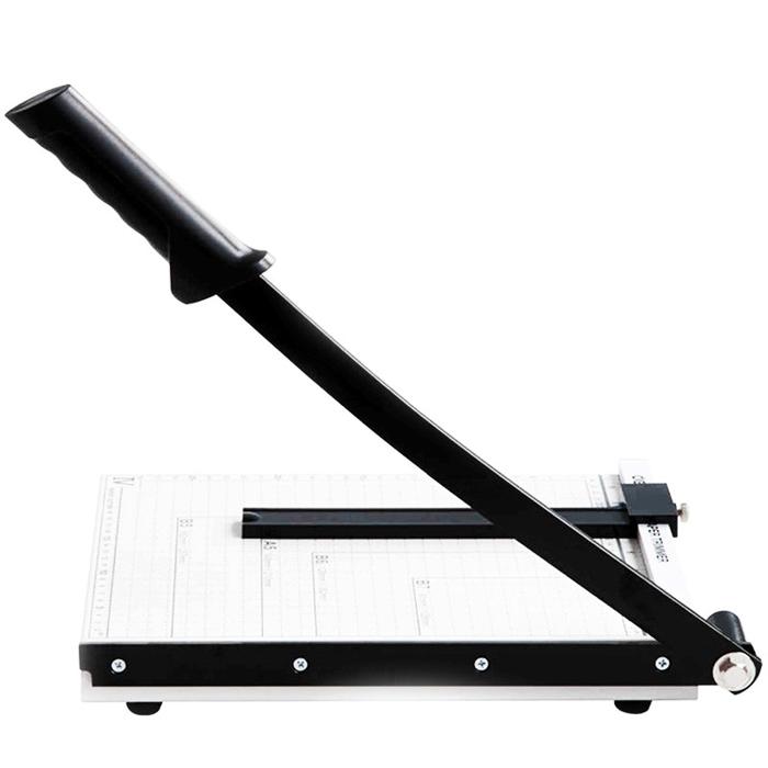 - сабельные. Рабочее поле изготовлено из металла, на нем нанесена сетка, форматы бумаги и линейки для точного выравнивания стопки. Основная деталь — длинное лезвие в виде сабли, которое поднимается и опускается рычагом. На противоположной стороне установлен неподвижный нижний нож, о который верхний режущий инструмент срезает бумажное изделие. Лезвие у сабельного резака прямое и вытянутое, заострено по всей длине и работает по принципу ножниц: при опускании верхнего ножа бумага зажимается неподвижным лезвием и разрезается вдоль всей линии за один прием. Такой способ дает чистый рез без смещения листов, даже если стопка толстая. В отличие от роликового резака, здесь используется механическое усилие руки, поэтому качество разреза зависит от равномерности нажатия. Стандартные офисные устройства справляются с 30–40 листами бумаги плотностью 80 г/м² за один раз. Усиленные резаки могут разрезать стопку до 70–80 листов. Профессиональные варианты для полиграфии рассчитаны на рез толстых пачек, включая тонкий картон и ламинированные материалы. Еще одна особенность — возможность резать бумагу нестандартных форматов и даже небольшие пачки картона, чего не позволяют компактные роликовые модели;
